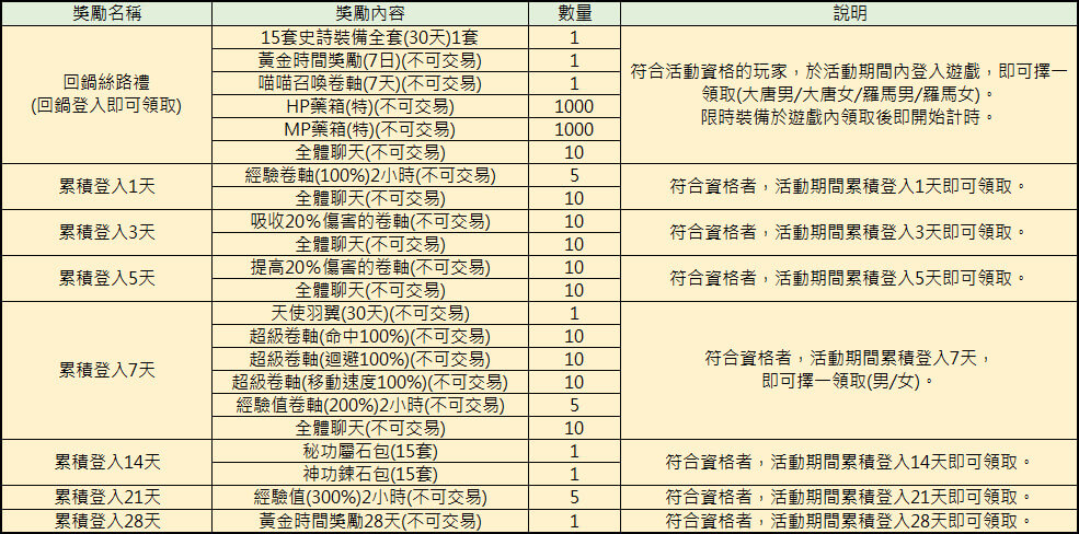 6. 所以獎勵除秘功屬石包(15套)、神功鍊石包(15套)、15套史詩裝備全套(30天)及15套神器裝備全套可交易,其餘獎勵皆無法交易。