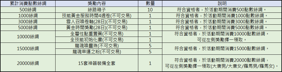 2. 活動二為「消費」性質活動,消費意即於遊戲商城中,使用「點數絲綢」購買任意金額道具的行為。