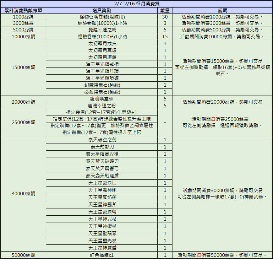 8.累計消費點數「25000、50000絲綢」可循環獲得(但不包其他累計消費點數獎勵),意即累計消費25000絲綢可獲得1次25000資格,