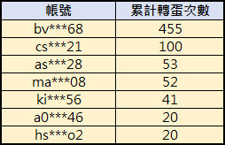 活動期間內,玩家於遊戲商城內累積購買「轉蛋」即可獲得轉蛋次數,