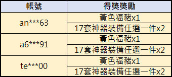 2.依官方公布得獎名單後,玩家需自行回報得獎資訊(裝備性別/部位/類別)至客服中心。詳細裝備資訊請參考「17套裝備」。