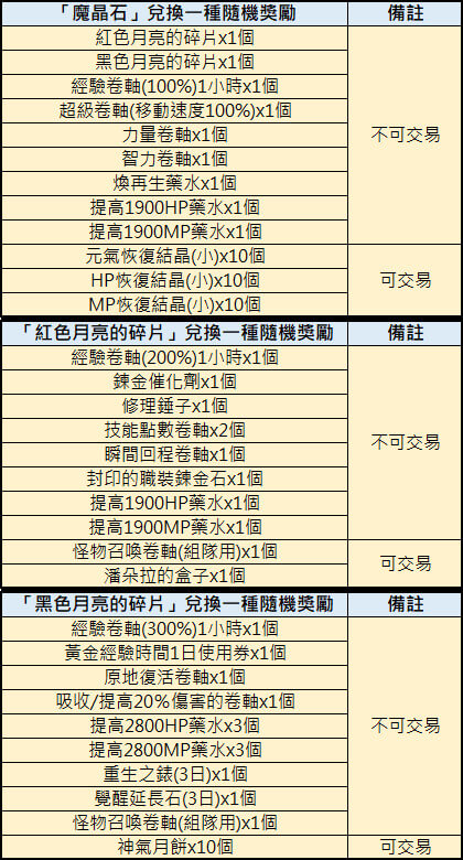 ※紅色月亮的祝福 : 全伺服器獲得經驗值/技能經驗值增加50%、攻擊力增加10%,持續1小時。