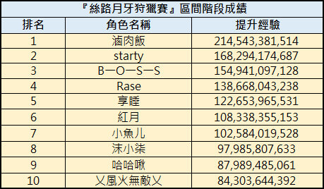 您好,本篇公告為【絲路月牙狩獵賽】活動的區間階段排名及成績!